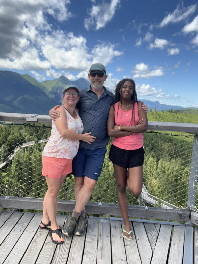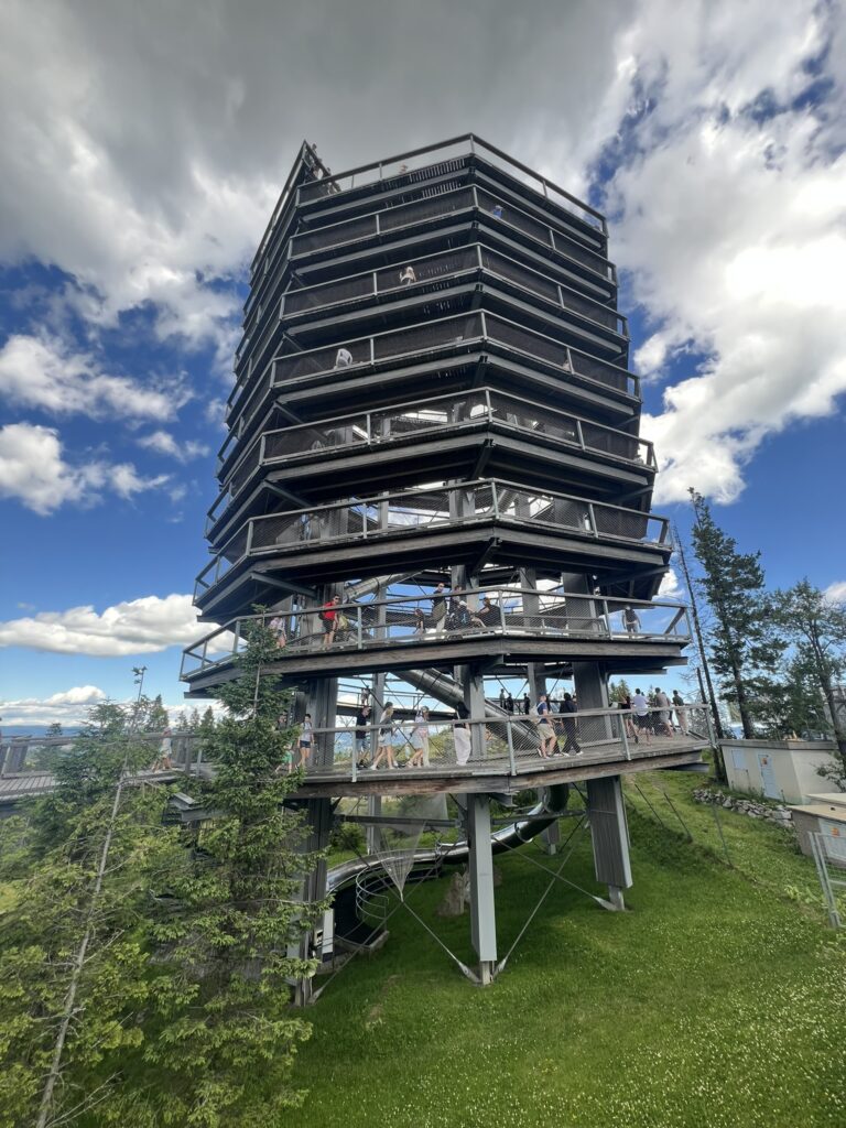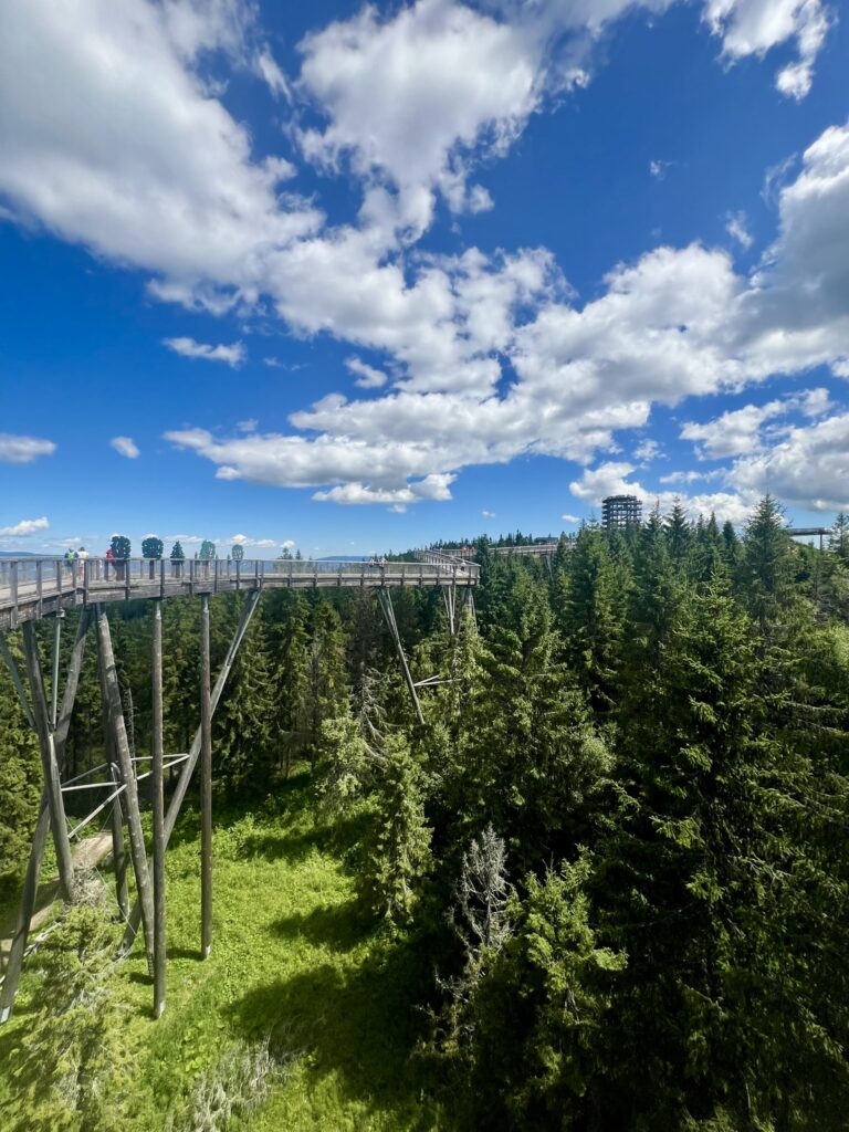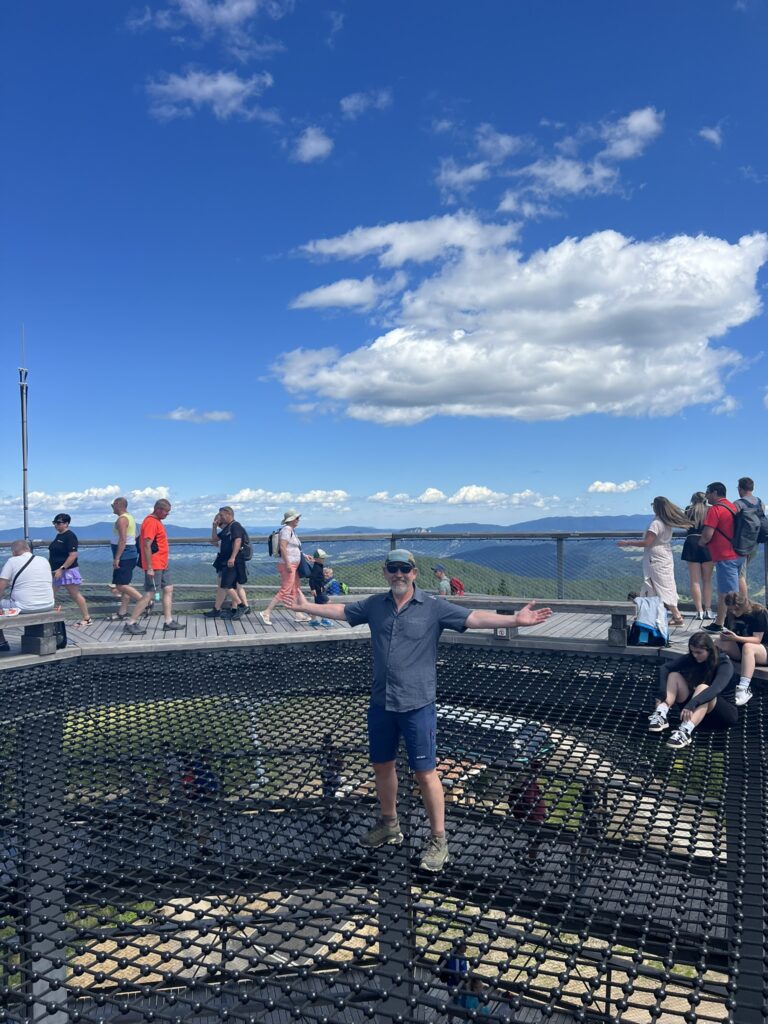 Og wauu for en oplevelse. Her er ca. 600 meter lang træbro i højde med trætoppene, der ender i et 32 meter højt træ-toptårn. En virkelig flot oplevelse med flotte udsigter til Tatrabjergene.